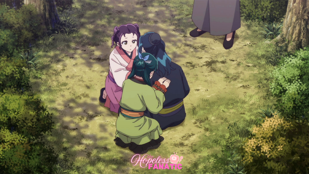 Before she successfully unveiled her discoveries, Suirei resurfaced and took both Maomao and Shisui, the bubbly servant girl, captive. While they are in transit to a new destination, Maomao concludes Shisui and Suirei are sisters when the former protects the latter from Maomao’s snake attack.