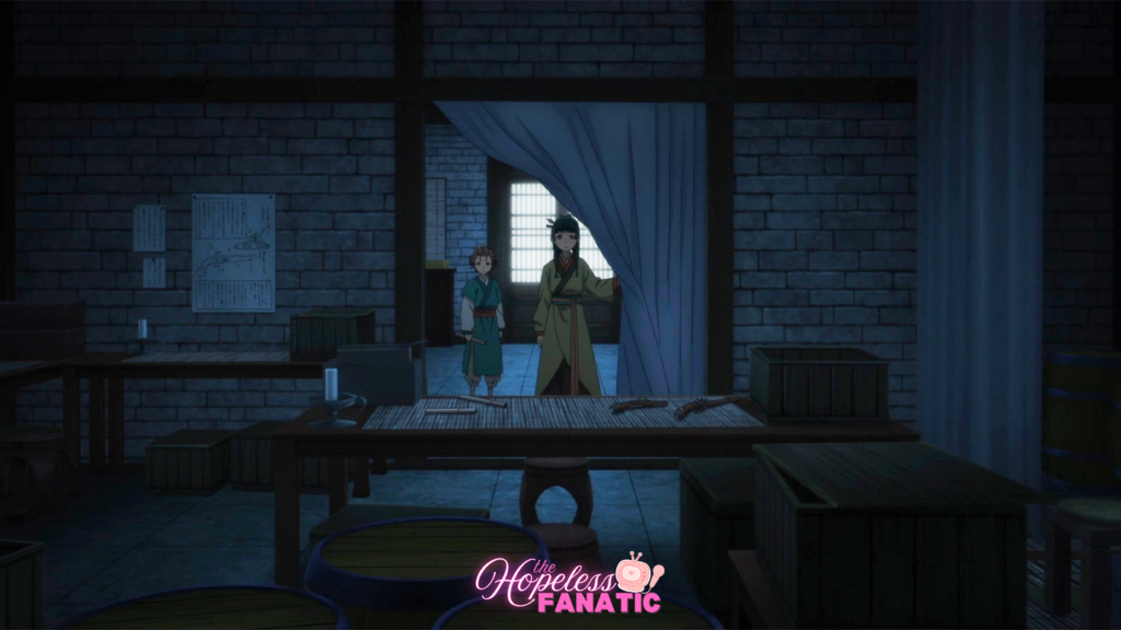 Fast forward a few episodes, both Shisui and Suirei have business to attend to during the day, leaving Maomao alone with Kyou-u. The unlikely duo managed to quietly escape the building where the sisters left Maomao, and ultimately find themselves at an odd storage house.
